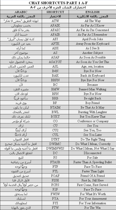 INTERNET SLANG & CHAT SHORTCUT PART 1 A-F, With Arabic
